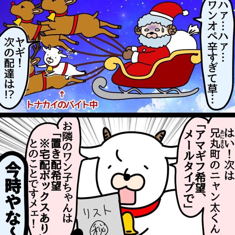 創作ギャグ漫画【創作ギャグ漫画】クリスマスでトナカイバイトする山羊 クリスマスでトナカイバイトする山羊 あとがき メェリークリスマス!(季節外れ) 最後のケーキのくだりは時事ネタです . . 2025.09.03創作ギャグ漫画